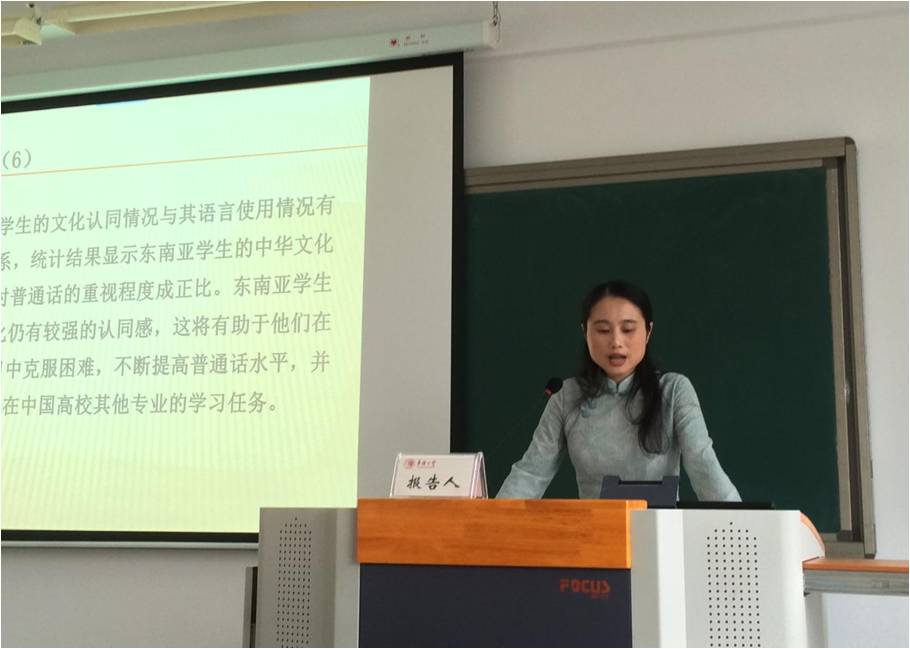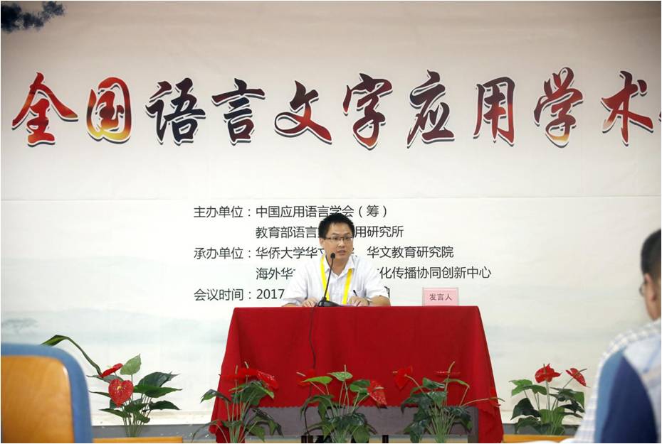 本次会议分五个小组进行讨论。胡斌彬老师的报告《成语的语义偏离、语料库调查与规范问题》,对成语的语义偏离情况进行了分类,针对建国以来社会各界对于成语语义偏离的意见分歧,提出在大型语料库调查的基础上,对成语的语义偏离进行区别对待。朱媞媞老师的《东南亚华裔留学生的语言使用情况及文化认同调查研究》报告,对福建省三所高校的301名东南亚华裔留学生的语言使用情况和文化认同进行调查,在详实数据的基础上,得出了东南亚华裔留学生的文化认同情况与语言使用情况密切相关的结论,其对中华文化认同程度与普通话重视程度成正比。