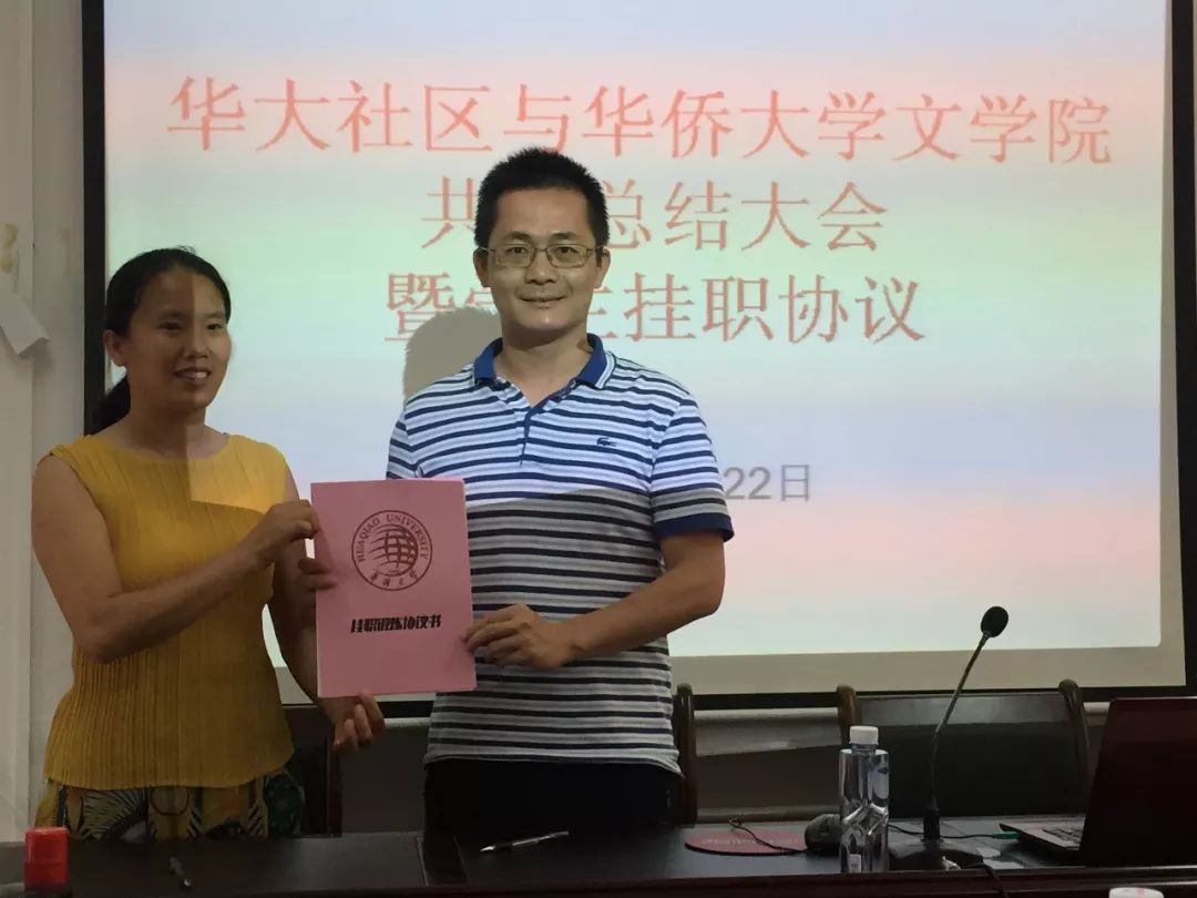5月22日下午3点,华侨大学文学院本科生党支部与华侨大学社区党支部在华大社区服务站举行了华大社区接收华侨大学文学院选派学生挂职锻炼签约仪式。华大社区华大街道党支部书记庄建珠,华侨大学文学院团委书记张伟老师等20余人参加了仪式,仪式由文学院曾俞晓同学主持。