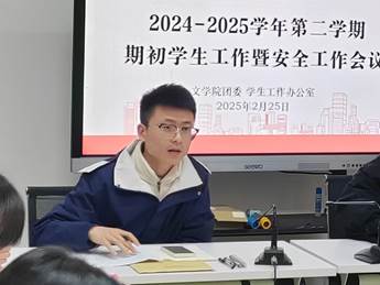 2月25日下午,文学院于学院三楼会议室召开2024-2025学年第二学期期初学生工作暨安全工作会议。团委书记杨景惠,辅导员赵越、张奕欢,兼职辅导员管会群,两委常委、各班班长、团支书参加本次工作会议。