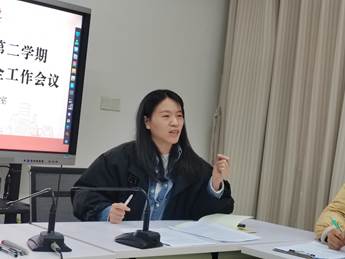 最后,杨景惠老师对新学期学院工作作出强调。首先,各班班长要带动班干部的工作积极性,动员班级同学参与学院活动及赛事,不断提高自身的综合素质能力。其次,班级与团支部可适当举办一些团建活动,加强凝聚力、向心力。此外,班长支书要关注班级同学的身心健康状况,借助开学第一课的机会,及时开展期初安全教育,巩固全方位的安全意识。最后,杨老师指出,学生干部要重视校园安全问题,对于兼职、请假、集体外出报备等制度做到烂熟于心。