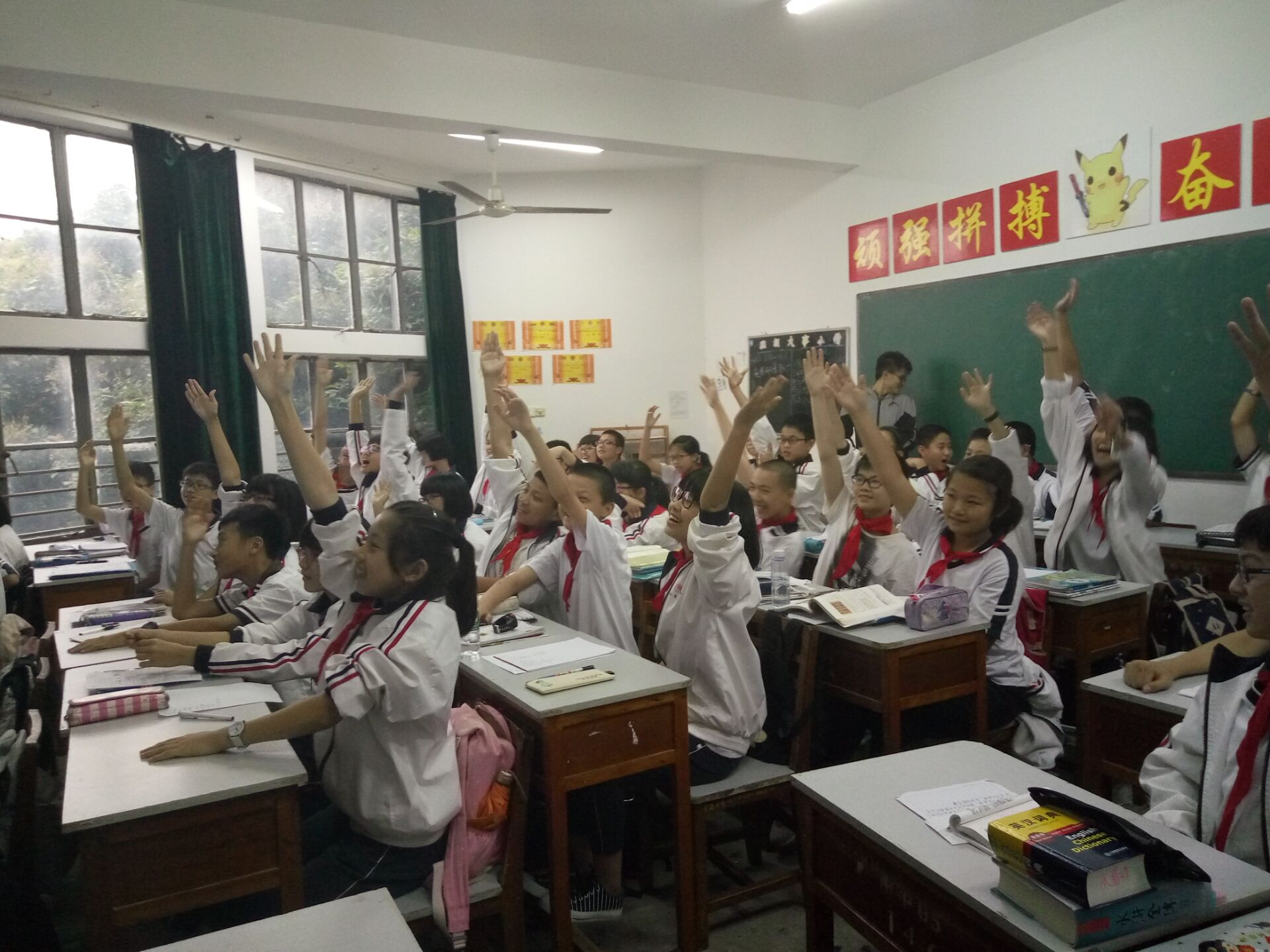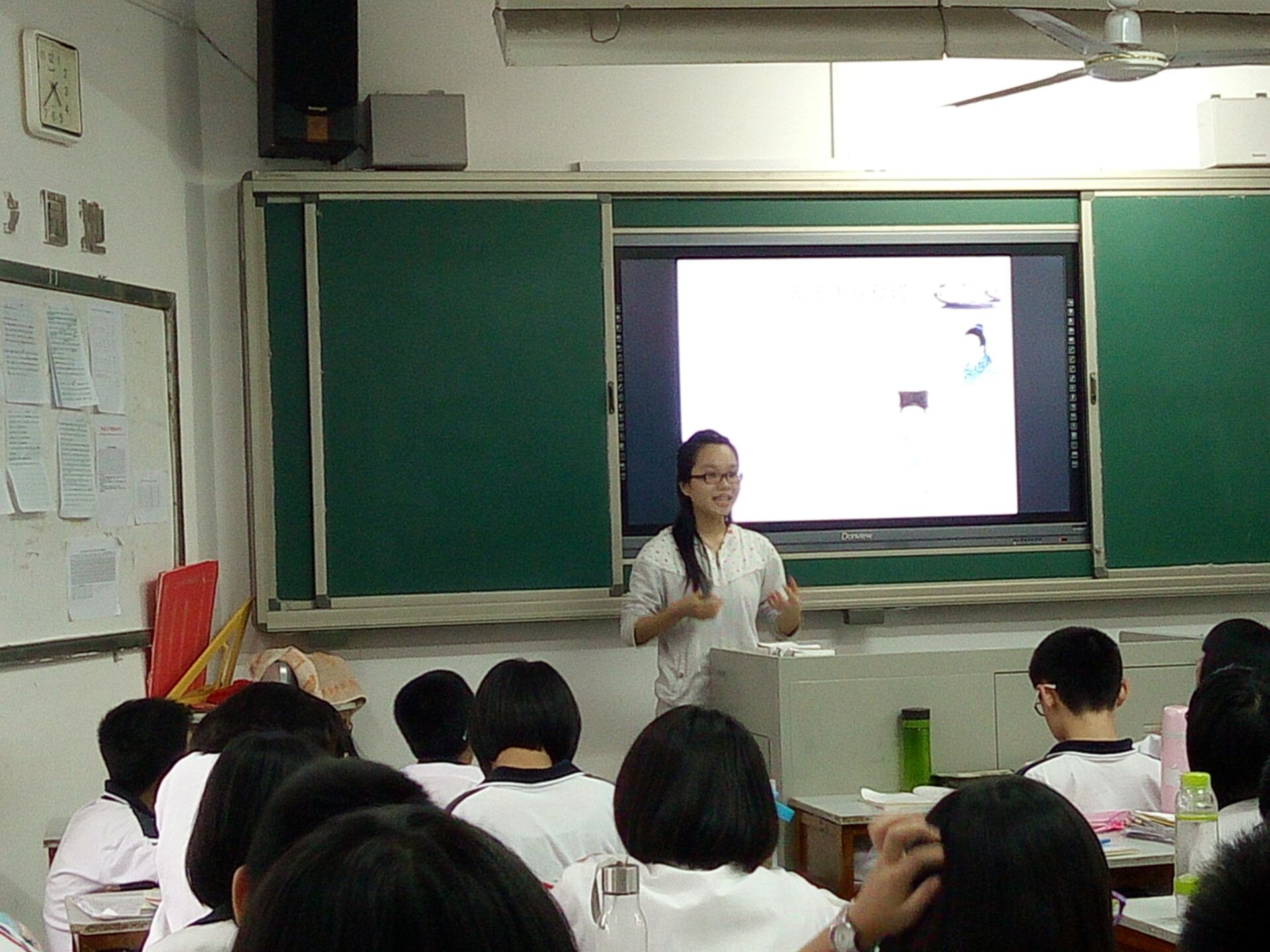 二班老师却以具有感染力的授课方式和洪亮的声音赢得同学们的一致好评,她看似腼腆,却有着身为老师的风范,与同学们相处的十分融洽,课堂氛围活跃。