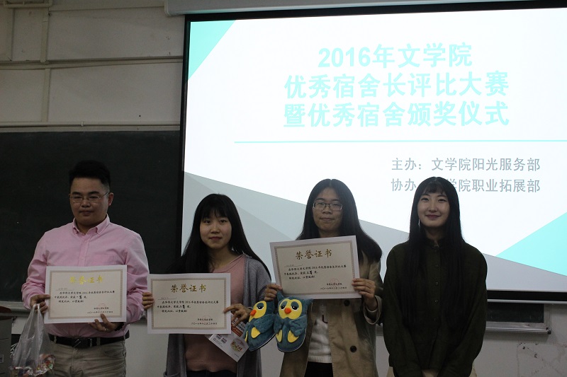 2016年12月24日下午三点,文学院优秀宿舍评比暨优秀宿舍长评比大赛在经管102举行,参与本次评比的嘉宾有兼职辅导员李岩,常委晏千皓、闪菲娅及许静雯,16级各班宿舍长到场观看。