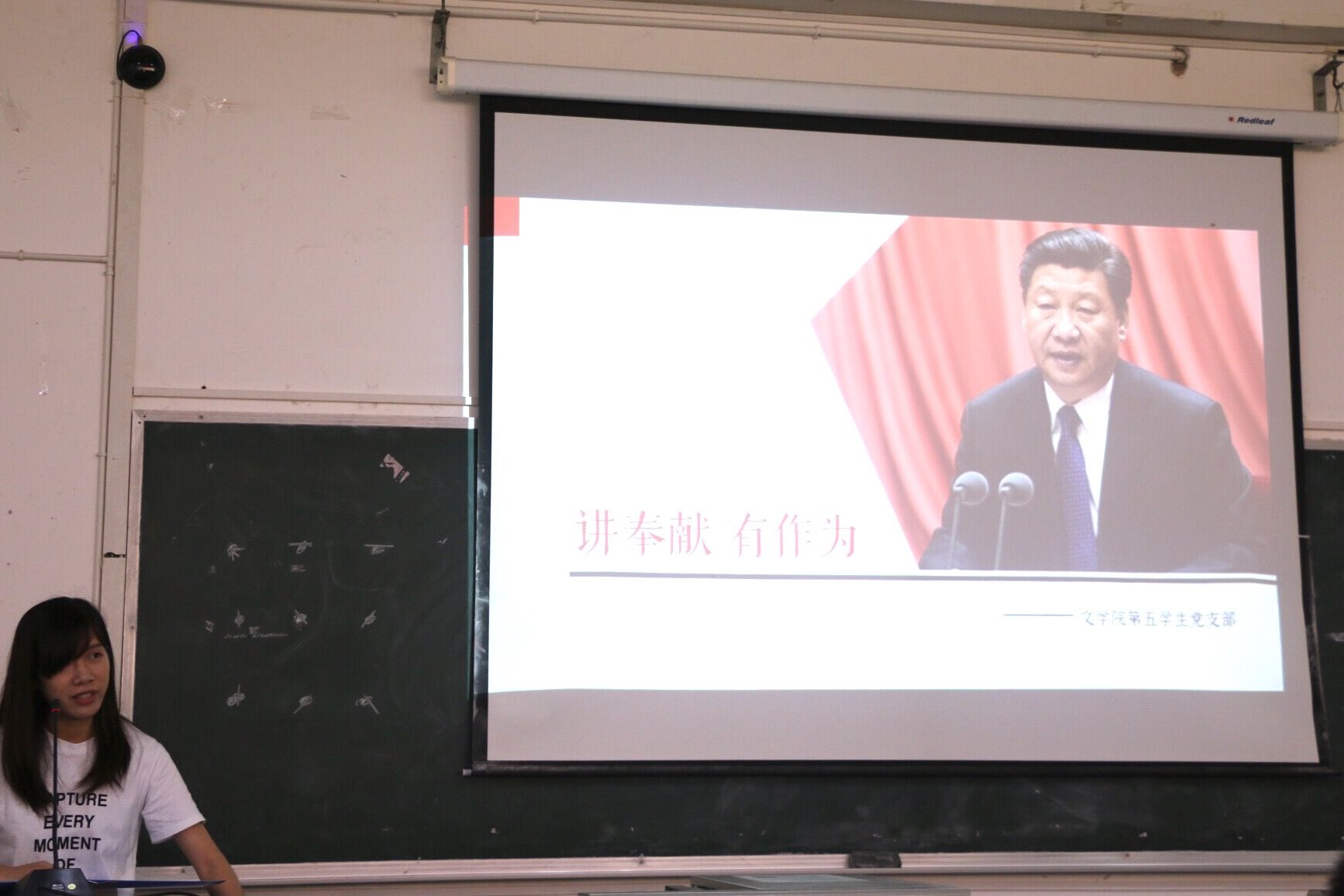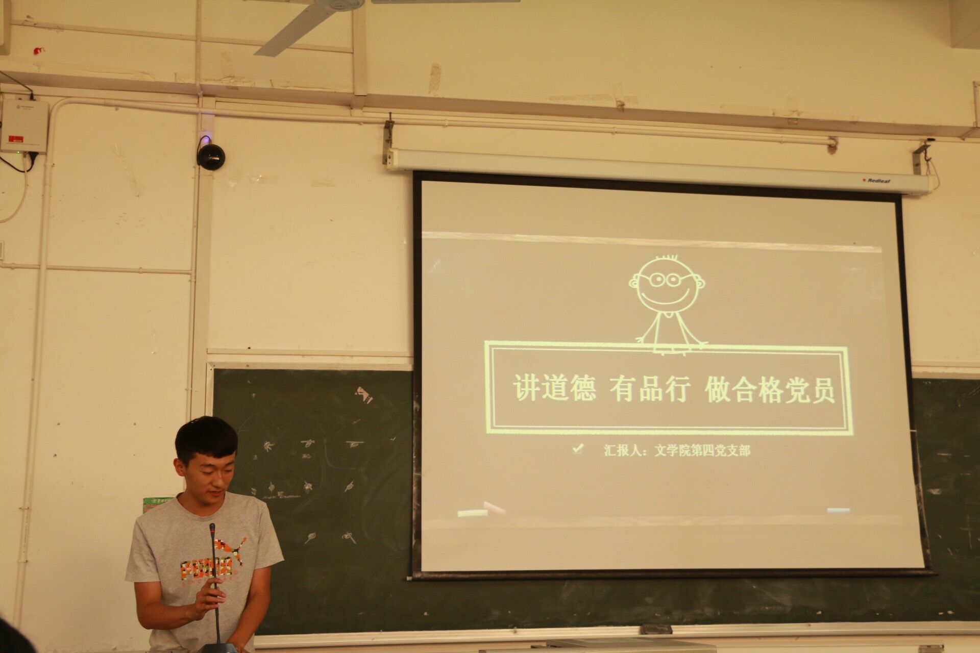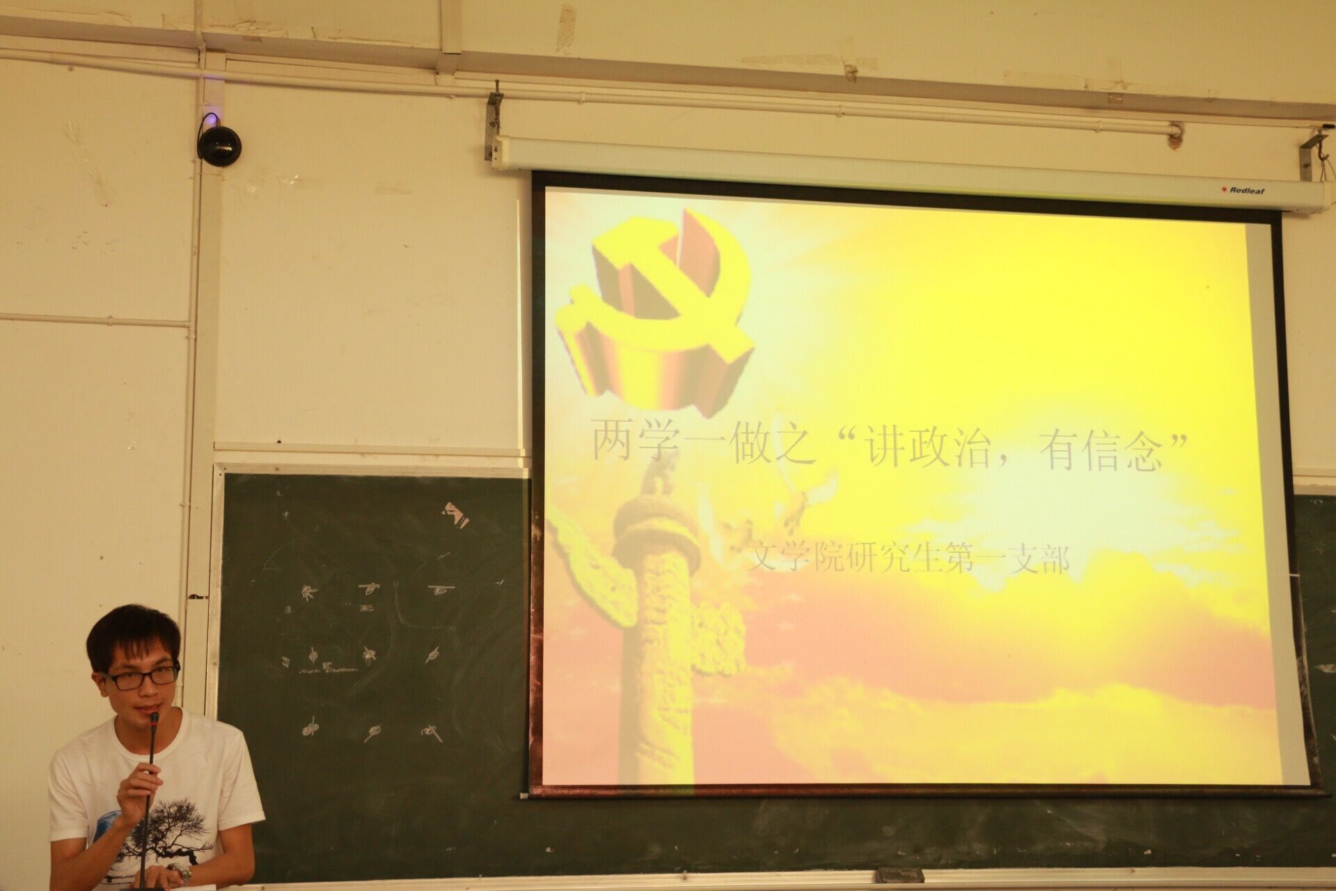 大讲堂开始,文学院党委副书记陈英文以“做一名合格的共产党员”为题生动地为在场的学生党员讲述了做一位合格的共产党员的定义、必要性、重要性、相关举措。之后,文学院研究生第一党支部、研究生第二党支部、第四党支部和第五党支部分别以“讲政治,有信念”、“讲规矩,有纪律”、“讲道德,有品行”、“讲奉献,有作为”依次进行专题汇报,分别向党员们阐述了合格的党员的标准与合格党员应该具备的素质。研究生党支部以声情并茂的诗歌朗诵带来了周恩来的诗作《悼念黄爱之死》;第四党支部引经据典讲述了从古至今“道德”含义的演变和在当今时代的崭新诠释,并且从学生党员、学生干部的实际情况出发,详细论述了如何做“讲道德、有品行”的学生党员;第五党支部通过党内先进党员事例让具体讲解了如何“讲奉献”。