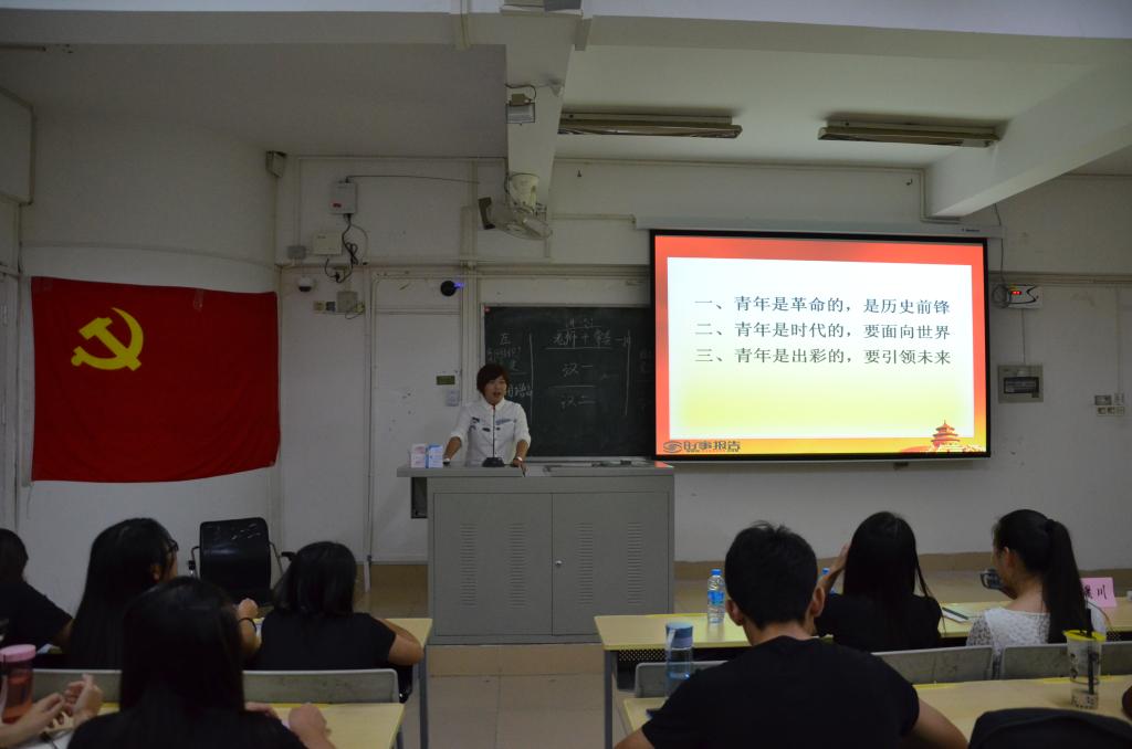 仪式结束后,开始了以“青年梦•中国梦”为主题的第一堂团课。团委书记肖景川老师上台为大家介绍了共青团的历史、发展以及团内活动等相关细节,并通过动漫短片让新生了解到了作为青年的责任和使命,激励同学们要奉献,要自强,有责任,有爱心。此外,肖老师还提到“青年是革命的、是时代的、是出彩的”,并对同学们提出了新学期的要求,要求同学们要培养沉稳的性格、学会处理好工作和学习的关系、学会正确地面对批评等,让同学们受益匪浅。