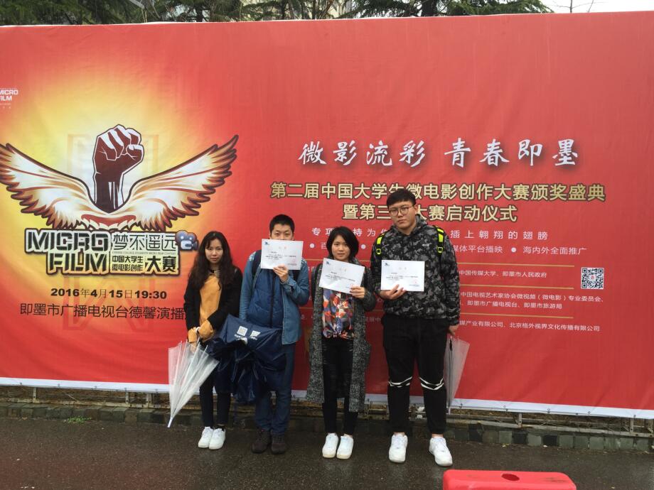 2016年4月15日,2015中国大学生微电影创作大赛在山东青岛即墨市落下帷幕,我校文学院微电影《再见曼谷》(新版)(作者:郭艳梅、钟日辉、黄灿妹、刘轶超、张舒宁、张心怡 ,指导教师:郭艳梅、黄志浩、朱志军)、《从心开始》(新版)(作者:黄灿妹、林翠萍、王璐珩、刘轶超、张舒宁、张心怡,指导教师:郭艳梅、黄志浩、朱志军)、《我和台湾的141天》(作者:严佳莹、韩筱涵、许青青,指导教师:郭艳梅、黄志浩、朱志军)三部作品获得入围奖。