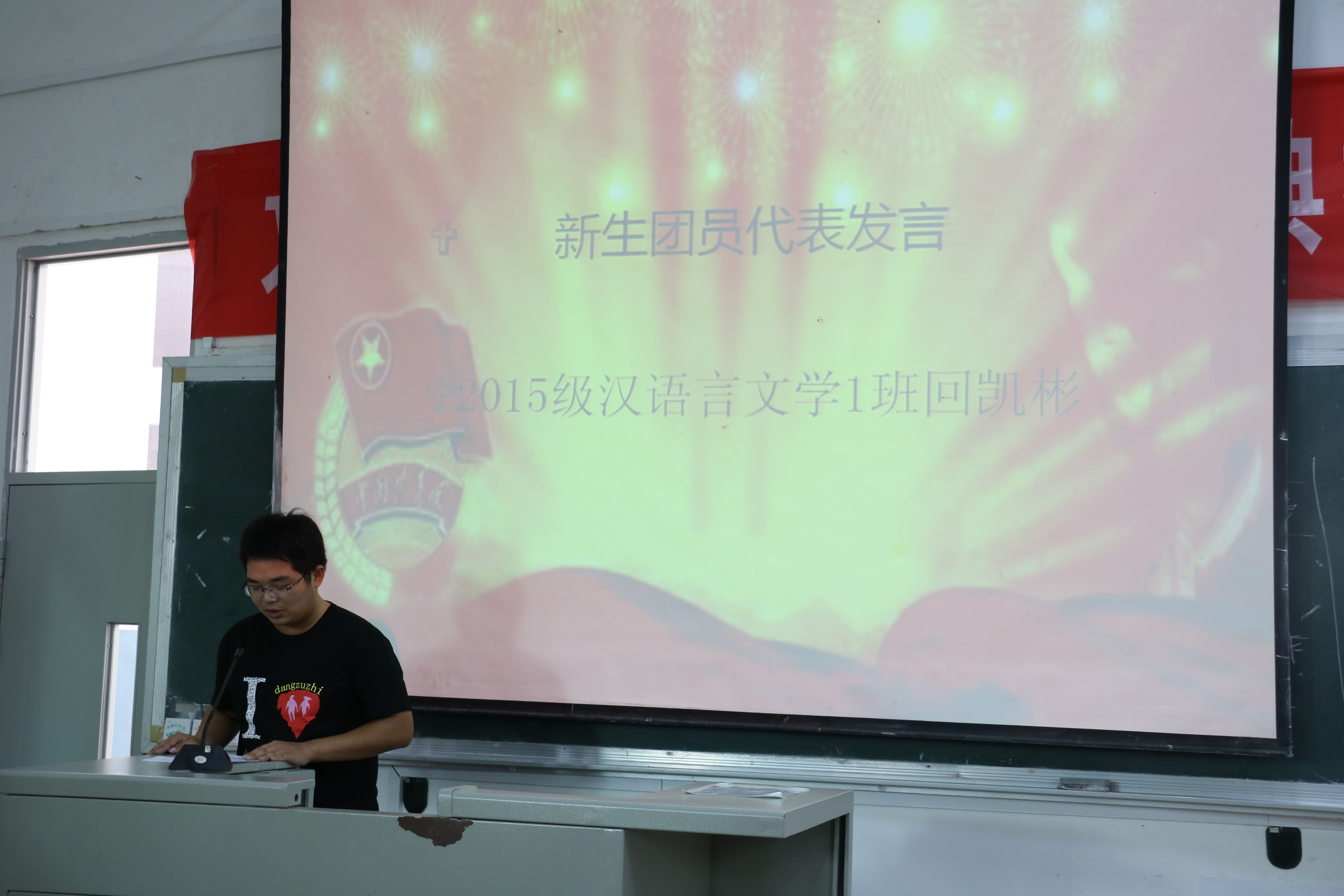 首先进行的是开班仪式,大家在激昂的团歌声中起立,心中满怀着对共青团的憧憬向往之情。接着文学院学生会常委郑红燕作为党员代表发言,向新生分享经验,她告诉同学们要树立理想,摆正心态,不忘初心,有始有终,才能把持好自己,过好大学生活。随后是新生团员代表——15级汉语言二班的回凯彬同学发表讲话,他谈到了树立目标的重要性,同时提醒自己和同学们要认真学习和工作,增强能力,提升自我,最后他向15级新生们献上了对新生活的祝愿。