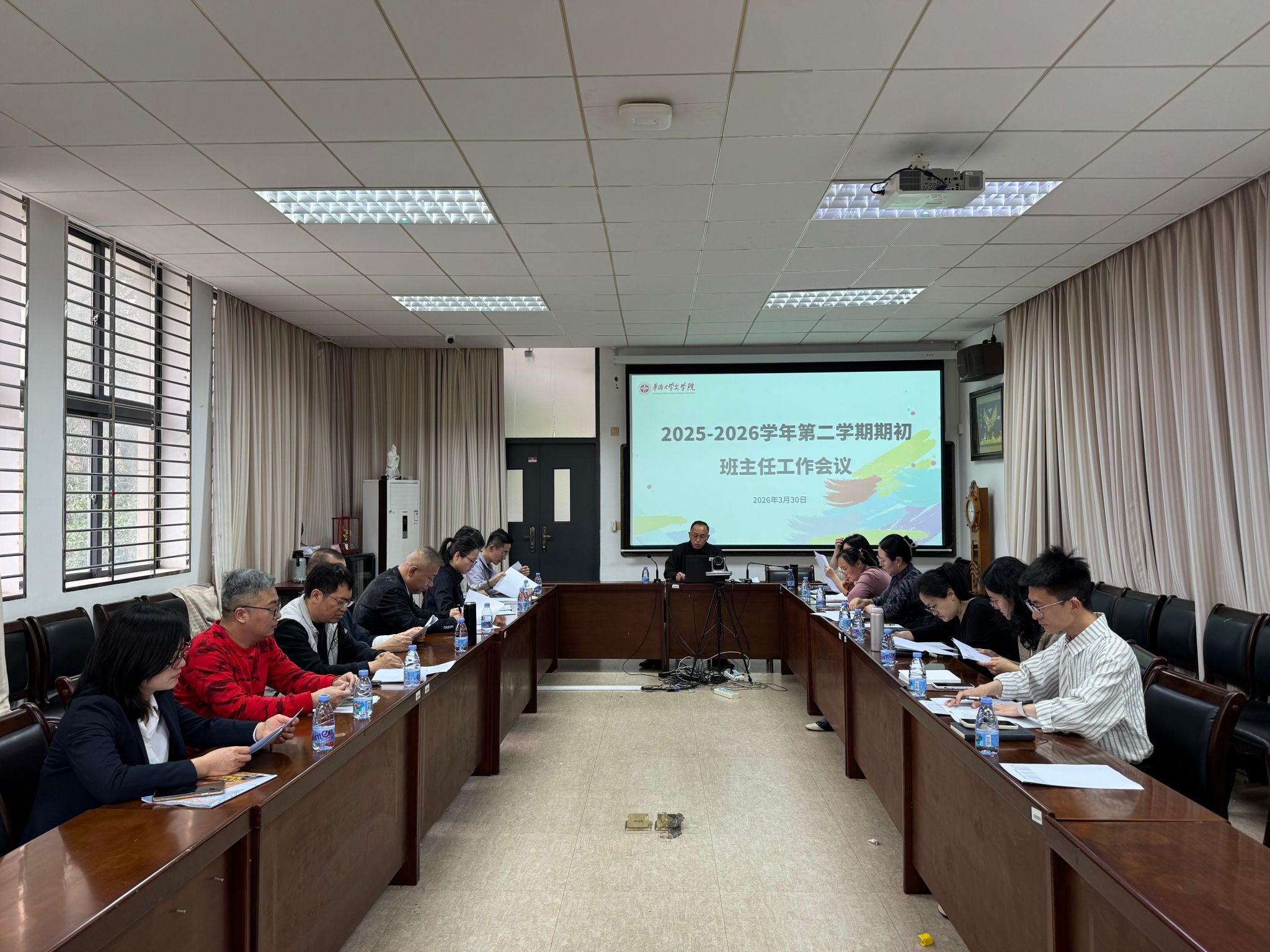 为进一步强化班级管理,压实育人责任,凝聚育人合力,3月30日下午,文学院2025-2026学年第二学期期初班主任工作会议在林秀华文科楼201会议室顺利召开。会议由学院党委书记涂伟主持,全体班主任、辅导员参会。