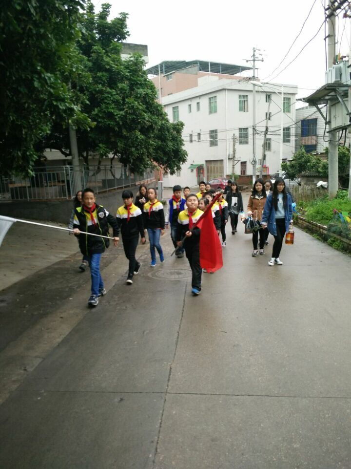 小学生分为两队,其中排头举着旗子,志愿者则提着礼品站在小学生两侧,以起到保护、引导作用。出发的时候,天下着蒙蒙细雨,路上湿漉漉的,但这丝毫阻挡不了大家对爱与付出的追求。一路上,志愿者们细心保护和引导,小朋友们充满热情和活力。