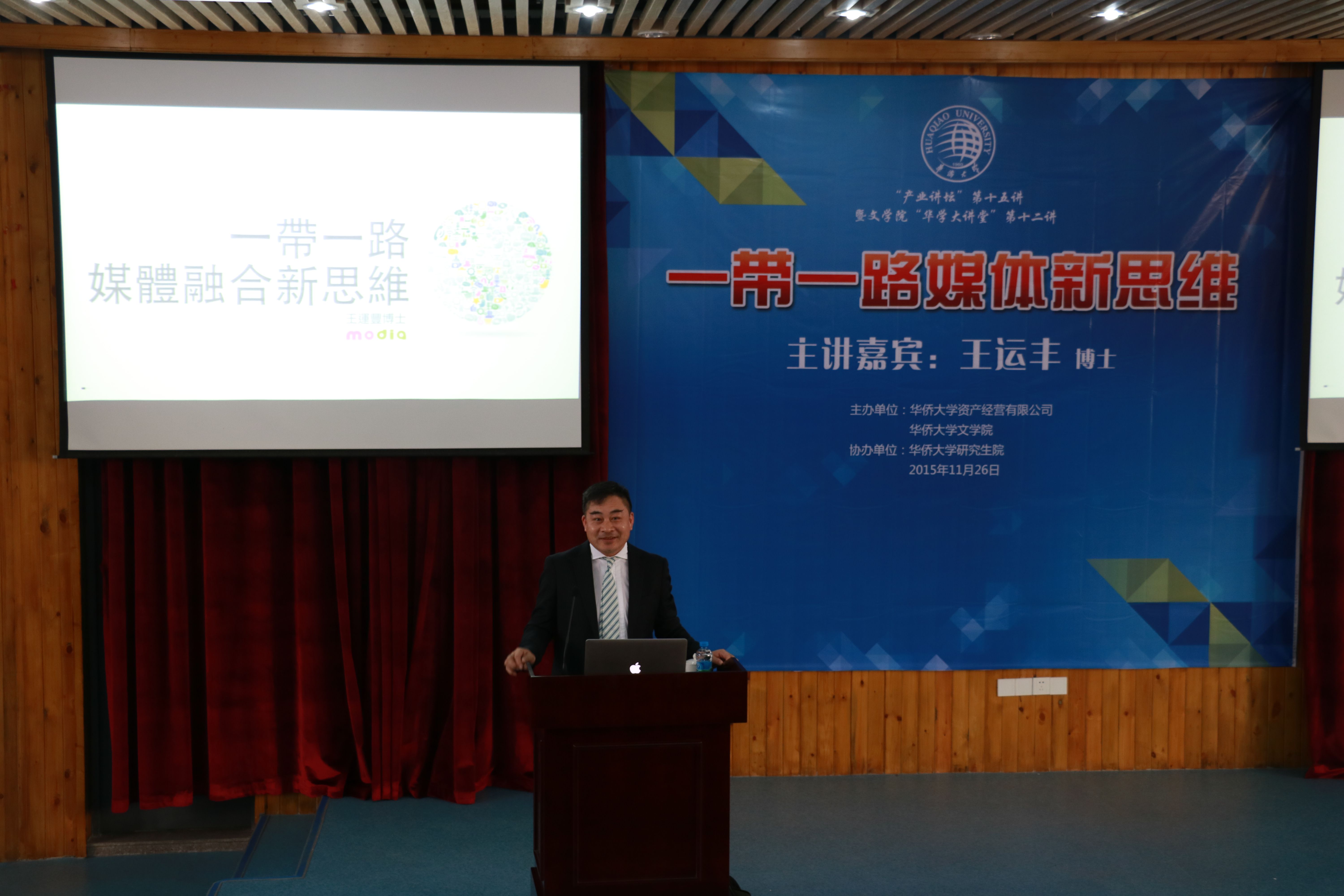 11月26日下午,香港广告业联合主席,香港资深传媒人王运丰在庄为烜报告厅举行“一带一路媒体新思路”讲座。华侨大学资产经营有限公司总经理涂伟,文学院副院长王琰等嘉宾受邀出席本次讲座,文学院14级新闻、广告班,13级广电二班的同学参加本次讲座。