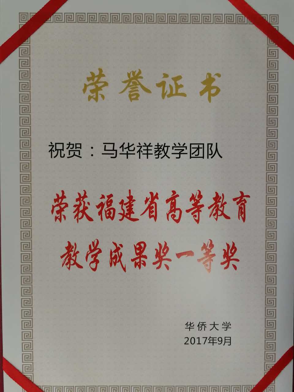 文学院与华文学院共同完成的教学成果《培养海内外中华文化传播人才的特色专业建设探索与实践》荣获2017年福建省高等教育教学成果奖一等奖, 该成果由文学院马华祥教授负责,王建设教授、徐华教授、蒋晓光教授、胡斌彬副教授与华文学院3位教师共同参与完成。