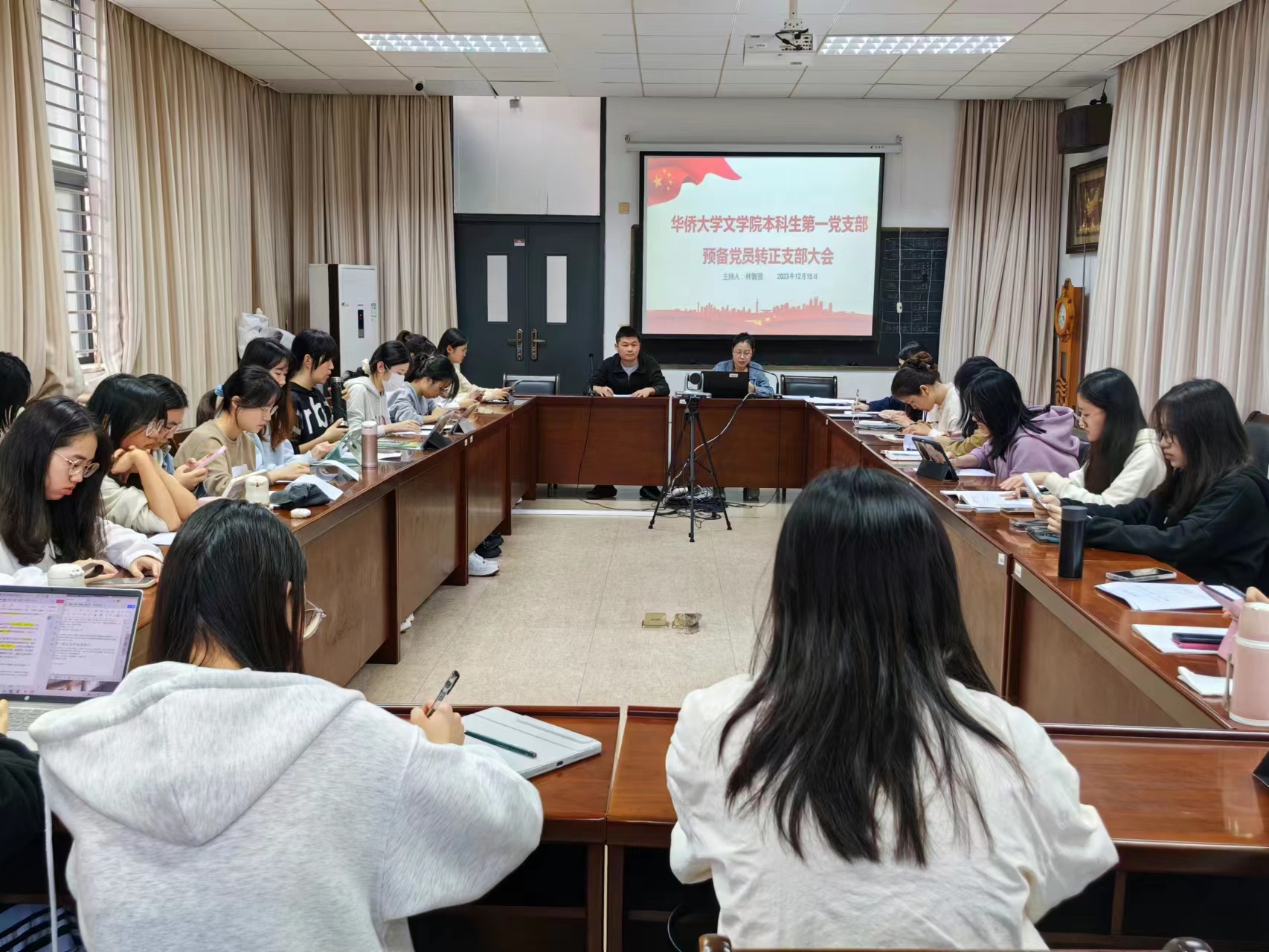 我院各学生党支部于12月15日至19日于文学院二、三楼会议室分别召开各党支部2023下半年预备党员转正大会。会议讨论了关于姚遥、张雅雯、王宜萌等15名预备党员的转正问题。