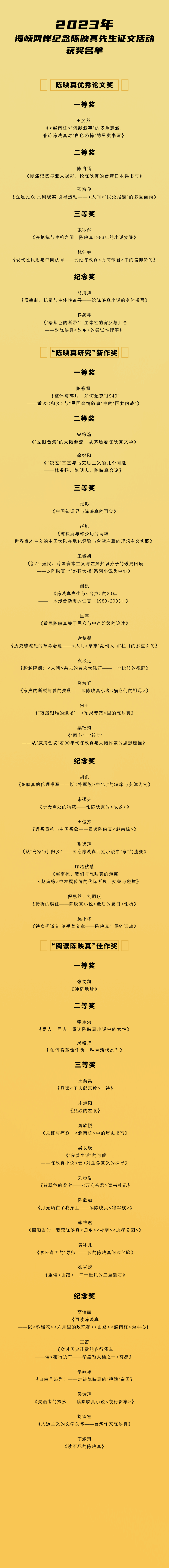 与前两届征文活动相比,本届征文实现了投稿数量与质量的“双突破”。自2023年11月征文启动以来,组委会共收到89篇投稿,主题涵盖学术研究、文学创作与阅读感悟。经评审,王斐然《〈赵南栋〉“沉默叙事”的多重意涵:兼论陈映真对“白色恐怖”的另类书写》等7篇作品获评陈映真优秀论文奖;陈彩霞《整体与碎片:如何超克“1949”——重读〈归乡〉与“民国悲情叙事”中的“国共内战”》等20篇作品获评“陈映真研究”新作奖;张钧凯《神奇地址》等18篇作品获评“阅读陈映真”佳作奖。