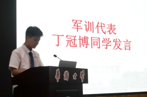 军训学员代表丁冠博,代表全体新生郑重承诺:军训期间,我们将思想行动合一,尊师敬教、严守军令、服从指挥,以严谨之态,行刻苦之训。我们团结互助、勇于吃苦、奋力争先,誓以高标准自我鞭策,圆满达成军训每一项任务,展现青春风采。
