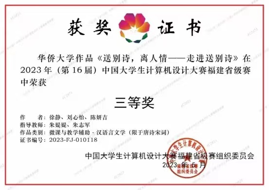 秋风送爽,丹桂飘香。随着2023年(第16届)中国大学生计算机设计大赛的帷幕落下,华侨大学文学院的参赛选手终于将两张国家级奖项揽入怀中。至此,参与本届比赛的6部参赛作品,接续斩获国赛和省赛共8个奖项。