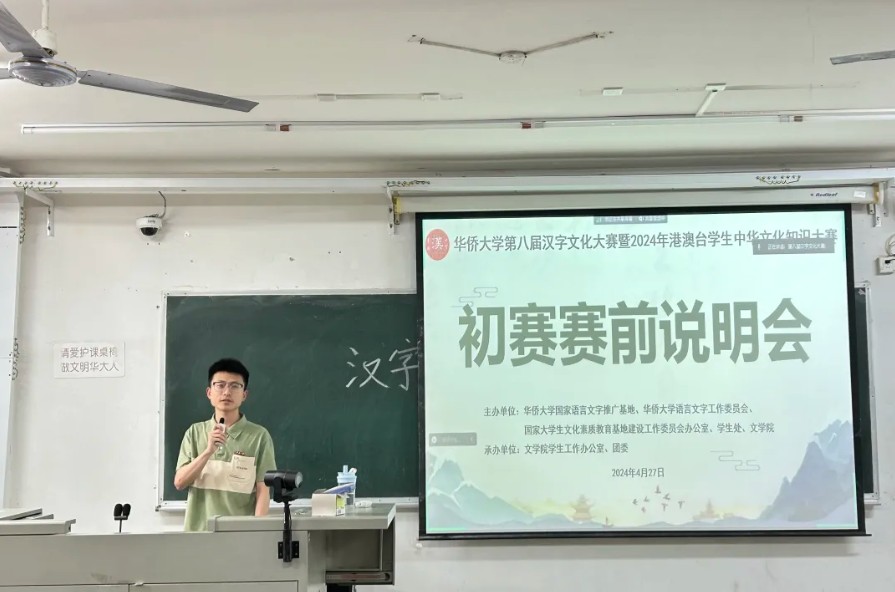 4月27日下午,华侨大学第八届汉字文化大赛暨2024年港澳台学生中华文化知识大赛初赛于泉州校区敬萱堂顺利举行。大赛由华侨大学国家语言文字推广基地、华侨大学语言文字工作委员会、国家大学生文化素质教育基地建设工作委员会办公室、学生处、文学院主办,文学院团委、学工办、研究生会承办。