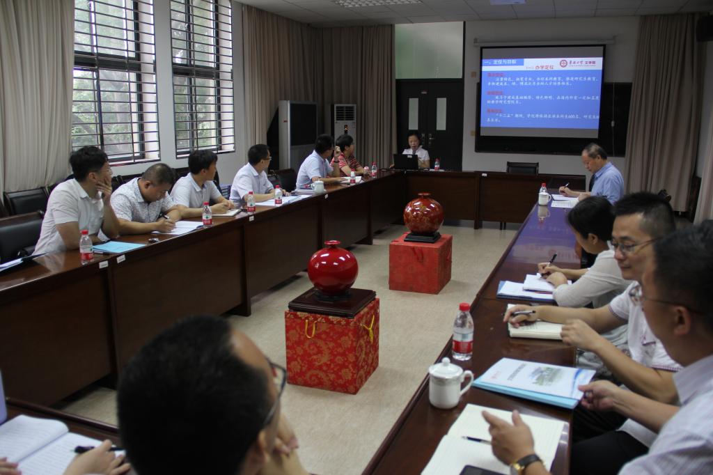 在二楼会议室,常彬院长向曾明教授做文学院本科教学工作审核评估自评汇报。她围绕“文学院本科教学工作审核评估自评报告”,从学院人才培养的定位与目标、师资队伍、教学资源、培养过程、学生发展、质量保障、特色项目等方面简要汇报了我院近年本科教学工作的政策措施和人才培养的达成度、适应度、保障度、有效度和满意度。