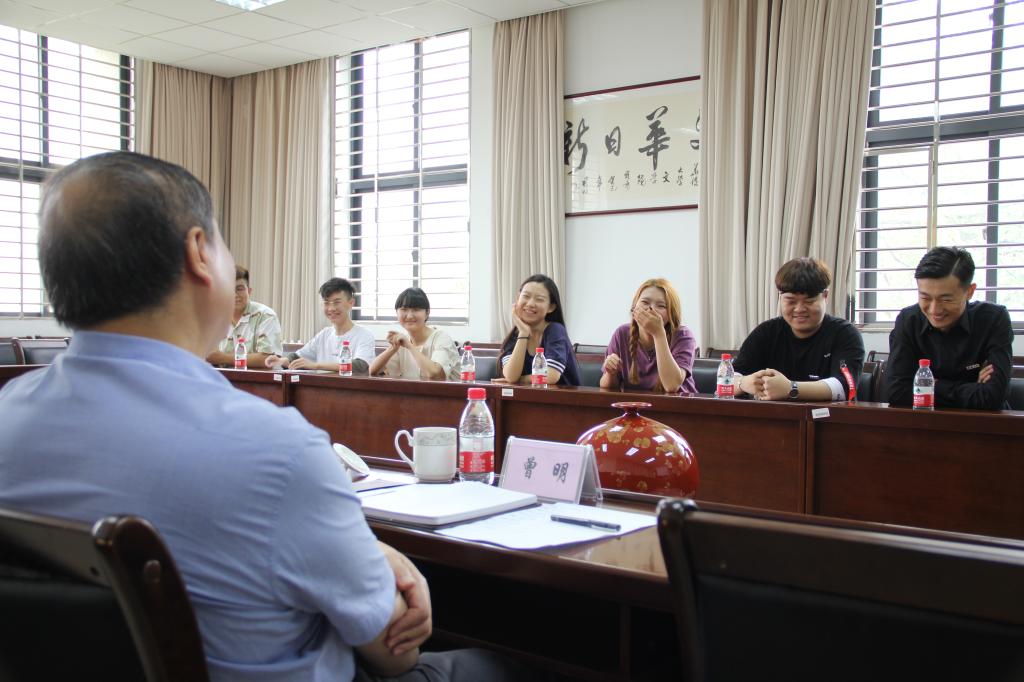 在学生座谈会上,不同年级、不同专业的学生代表针对曾明教授提出的“谈谈你印象最深的老师、课程,或者课程中最喜欢的人物”等话题,逐一发言。同学们对教学中表现优秀的老师及他们的课程表示喜欢,对认真上课、教学方式多样、有人格魅力、注重引导和交流的老师及课程印象深刻,对课程中自己崇拜或欣赏的文学人物表示喜欢并视之为榜样。在座谈交流过程中,曾明教授也问及学生生源、大学生涯的规划、毕业后的打算等问题,同学们都一一回答。交流过程中,曾明教授对文学院学生的综合表现和毕业生考研佳绩表示肯定和赞赏。