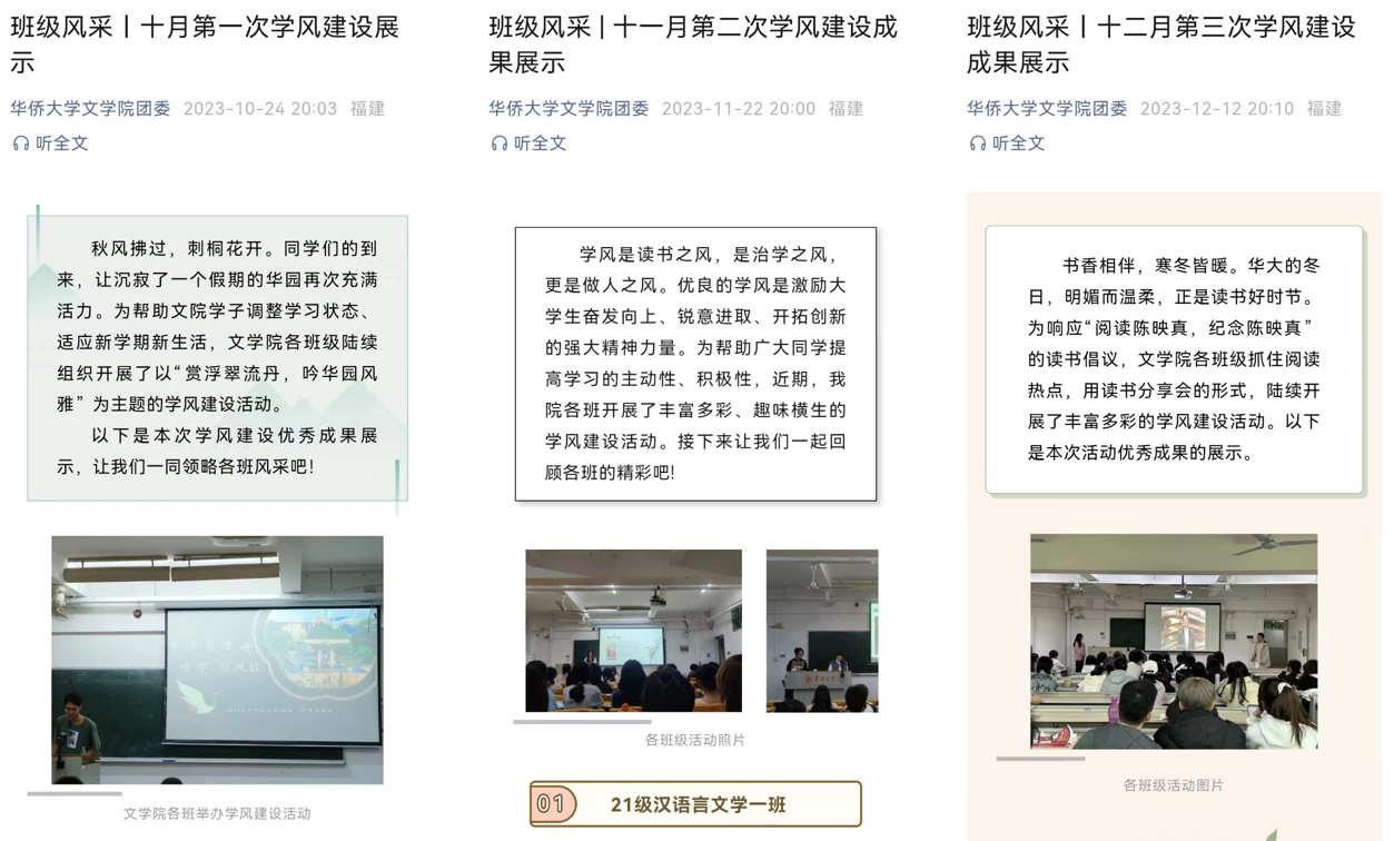 结合实际,文学院开展了形式多样、主题丰富的学风建设活动,打通第一、第二课堂之间的界限,使学风建设成果落地教育本身。以赛促学,赛学融合。学院积极鼓励学生参加学术活动、学科竞赛以及科创实践,提高学生学科素养,提高专业素质,涵养创新精神。学院依托闽南文化研究中心、中国传统文化研究中心、中国语言文字研究中心与海外华人文学暨台港文学研究中心的资源禀赋,鼓励创新创意的涌现。知行合一,实践导向。鼓励参与寒暑假社会实践,打造品牌社会实践让学生充分认识社会和自我,增强创新意识与综合能力。坚持志愿服务,擦亮“国学助教”和“星烛互耀”两张名牌,传承雷锋精神,培养学生独立自主意识和乐于奉献的良好品质,让立足于专业特色的志愿服务惠及社区以及各类人群。另外,学院积极拓展实践教学平台,开展访企拓岗、实习实践活动,开展考研考公、就业指导讲座,拓宽学风建设的领域,落脚于学生就业的大文章。活动育人,涵养文风。丰富第二课堂活动形式,举办“觞鼎”文化节、刺桐吟诵会,加深学生对中华文化魅力的理解,培养文化自信文化内涵。邀请著名学者与作家开展读书沙龙、开展“博雅读书分享会”,邀请专业老师参加交流研讨,将本科生与研究生带进阅读习惯养成的一盘棋,增强人文情怀与文化底蕴的涵养。