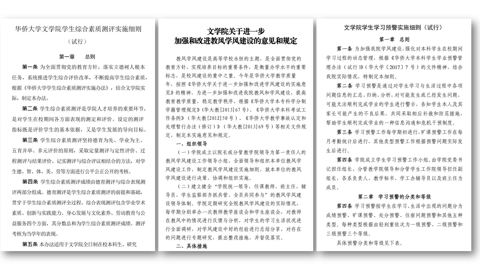 为打造老师满意、学生积极的师生双向认同课堂,在制度层面上有效规范学生的学习行为,文学院结合本院实际,成立了教风学风建设工作领导小组,全面领导和组织学院教风学风建设工作。打造规范体系,相继印发了《文学院关于进一步加强和改进教风学风建设的意见和规定的通知(文学〔2016〕10号)》《关于进一步加强学风建设的通知》《关于开展课前课后管理工作的通知》《关于开展学生课堂手机管理工作的通知》《文学院学生学习预警实施细则(试行)》等,详细规范了教学监督、教学管理、考风考纪、课堂纪律、请假考勤与违纪处分等工作。重视提前干预,建立健全学业预警学生档案,强化过程管理。区别对待旷课、成绩、住宿以及违纪问题,通过设置三级预警,厘清班主任、学工系统的分工与合作,引导对应学生认识到自身存在的各种问题,拟定改进计划,以确保如期完成学业任务。强化价值引领,利用《华侨大学文学院学生综合素质测评实施细则(试行)》激励学院学生从各个层面出发,兼顾学习与工作、知识与实践,提升自身综合素质能力,涵养时代品格。完善朋辈交流,创新督学制度和学业帮扶制度,增加学生组织对班级的督学督导、班级内部的互相帮扶,引导学生形成正确的学习习惯,营造团结互助的学习氛围,巩固学风建设的内生驱动力。