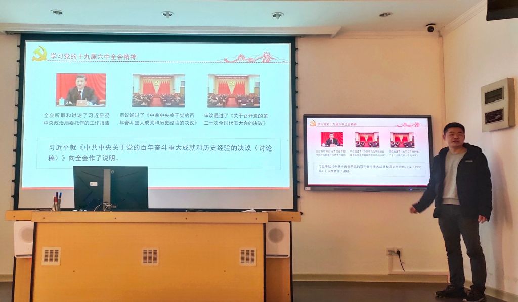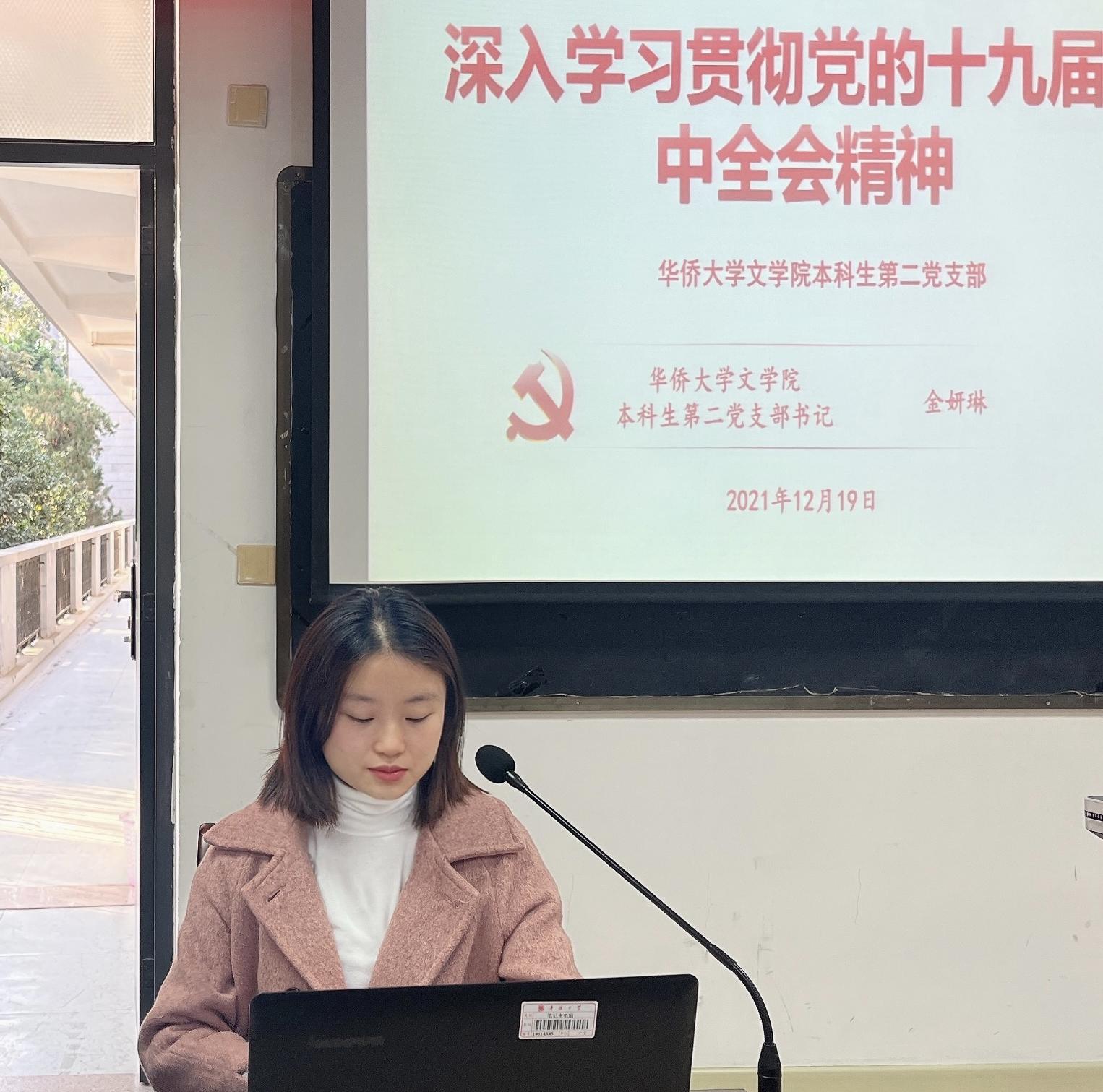 12月19日下午,文学院本科生第二党支部于文学院三楼多媒体教室召开党的十九届六中全会精神学习研讨会,会议由党支部书记金妍琳主持,支部全体党员参加。