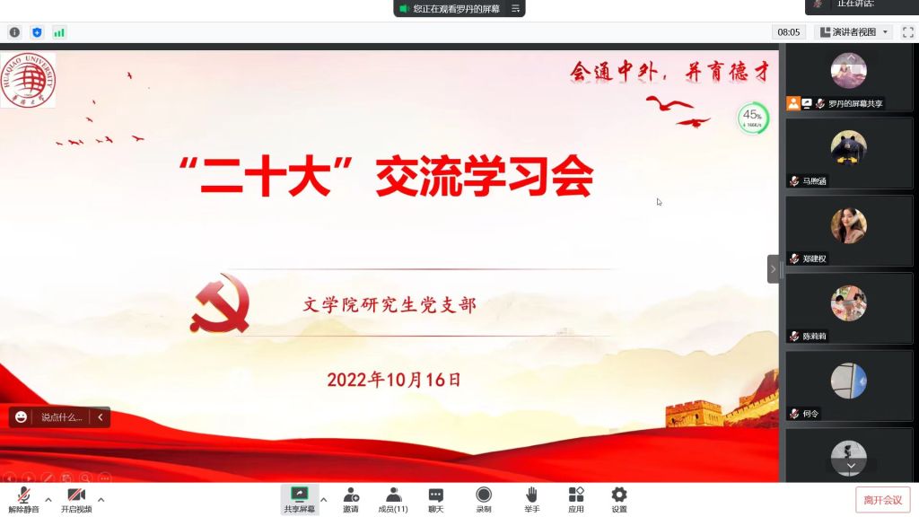 为深入学习贯彻党的二十大精神,文学院研究生党支部组织全体党员共24人,按照学校疫情防控相关规定,通过线上收看开幕会直播。习近平总书记的报告引起了大家的强烈共鸣,在开幕会直播结束后,支部立即召开了党的二十大交流座谈会,畅谈学习体会。