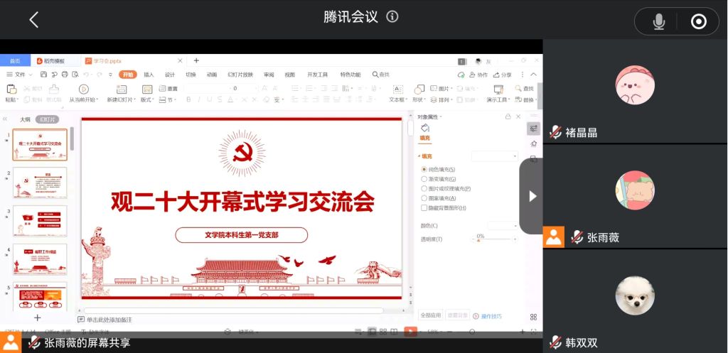 10月16日中午,文学院本科生第一党支部于线上开展了“观党的二十大开幕会”学习交流会。支部副书记张雨薇同志主持本次会议,本科生第一党支部全体党员参会,大家认真观看了二十大开幕会直播,并积极展开学习研讨与心得分享,会议气氛严肃热烈。