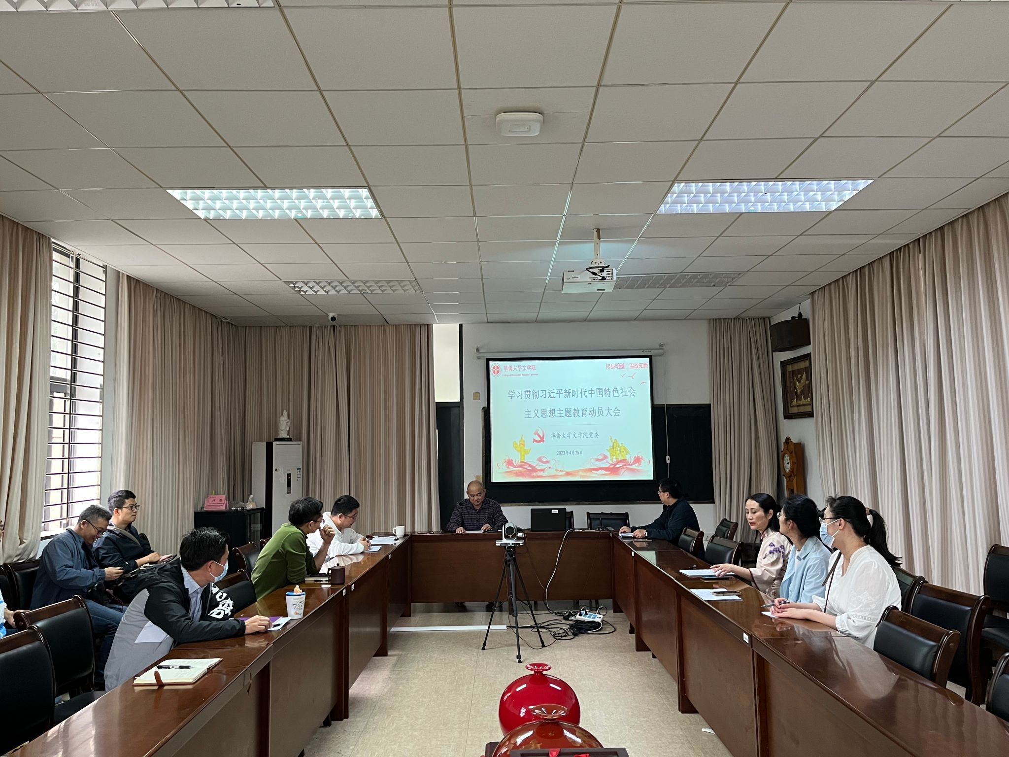 4月24日下午,经请示学校指导组,文学院党委召开学习贯彻习近平新时代中国特色社会主义思想主题教育动员大会,学院全体党委委员、全体师生党支部书记、党员代表参加会议。会议由学院党委书记钟炎生主持。