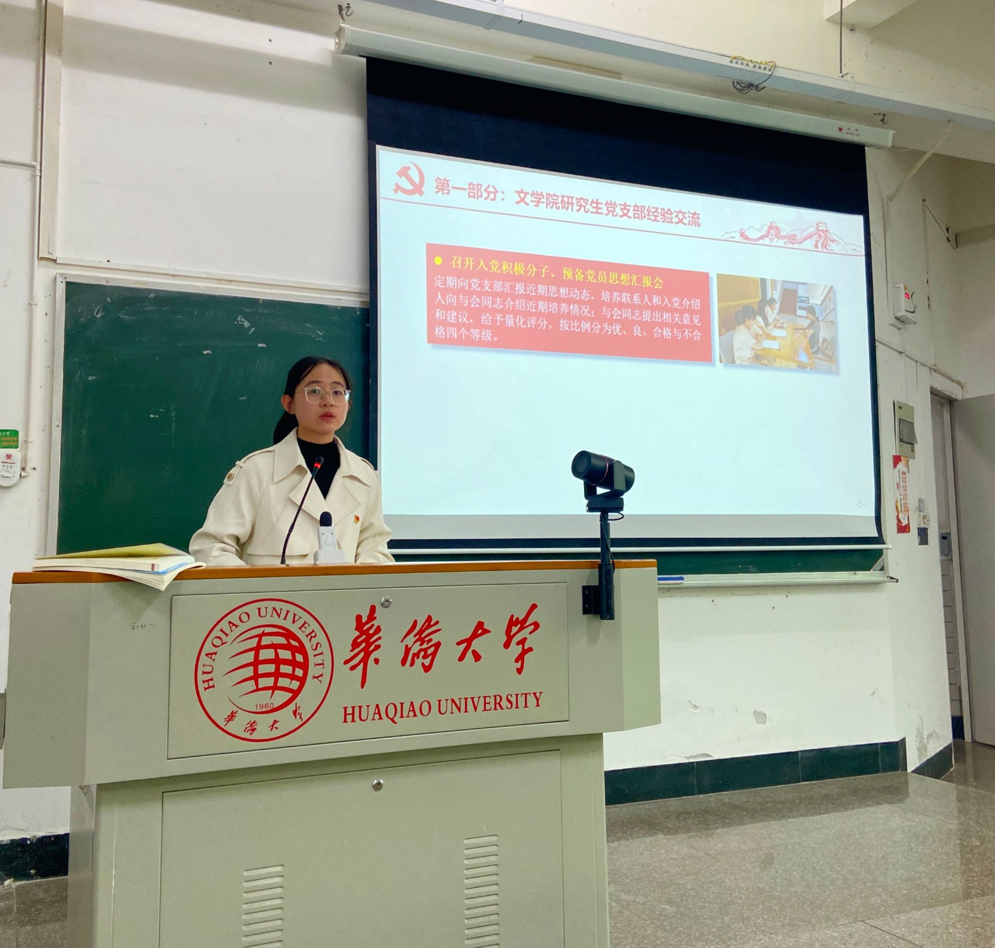 大学生党建工作是高校开展思想政治教育的重要抓手,也是加强思想政治工作的有效途径。作为华侨大学第二批党建工作示范党支部,文学院研究生党支部不断探索党建新模式,对照党支部培育创建“五个好”“三个有”的新标准,汇聚支部党员力量,激发党员活力,带领全体研究生党员发挥先锋模范作用。11月25日,研究生党支部副书记林传真作为代表,在华侨大学学生党支部书记培训班上分享了支部建设经验。