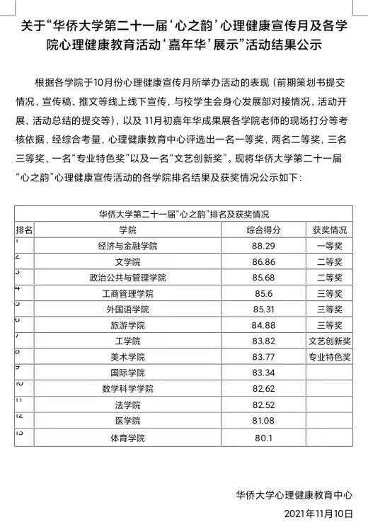 10月3日至11月7日,华侨大学开展了第二十一届“心之韵”心理健康宣传月活动。文学院积极配合校身心发展部的各项宣传工作,在本次“心之韵”活动中表现优异,取得了活动二等奖的佳绩。