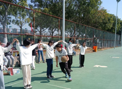 “趣味篮球赛”活动共分为五个环节依次进行。在裁判宣读规则后,各队成员在划分的场地范围内进行赛前准备。第一环节是“绕杆运球”,每名队员需要穿过队友展臂连接成的“障碍”完成运球。第二环节与第四环节则着重考验同学们投篮、运球的能力。第三环节“运球接力”需要队员们彼此合作,完成背对背、面对面运球以及曲线、直线运球等一系列任务指令。赛场上,同学们挥洒青春、活力四射,拼搏向上的昂扬精神悉数展现。