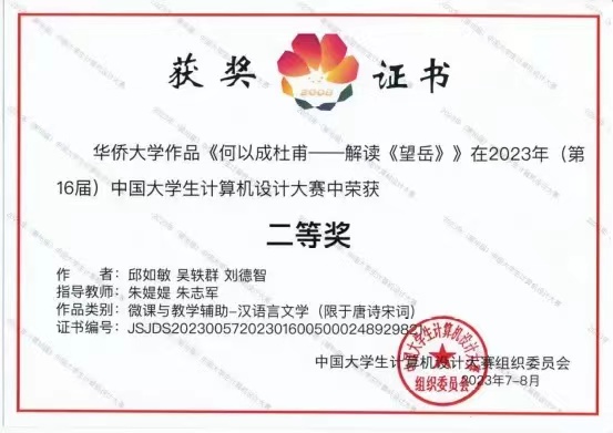 秋风送爽,丹桂飘香。随着2023年(第16届)中国大学生计算机设计大赛的帷幕落下,华侨大学文学院的参赛选手终于将两张国家级奖项揽入怀中。至此,参与本届比赛的6部参赛作品,接续斩获国赛和省赛共8个奖项。