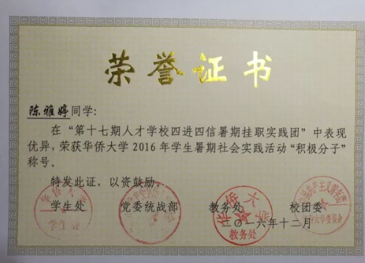 2016年学生暑期社会实践活动“积极分子”称号。