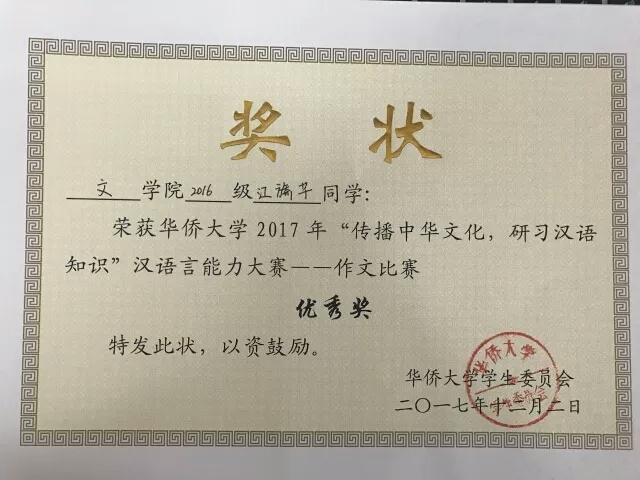 2017年境外生汉语言能力大赛(作文比赛)优秀奖