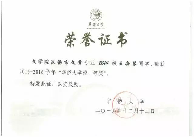2015-2016学年“华侨大学校一等奖”