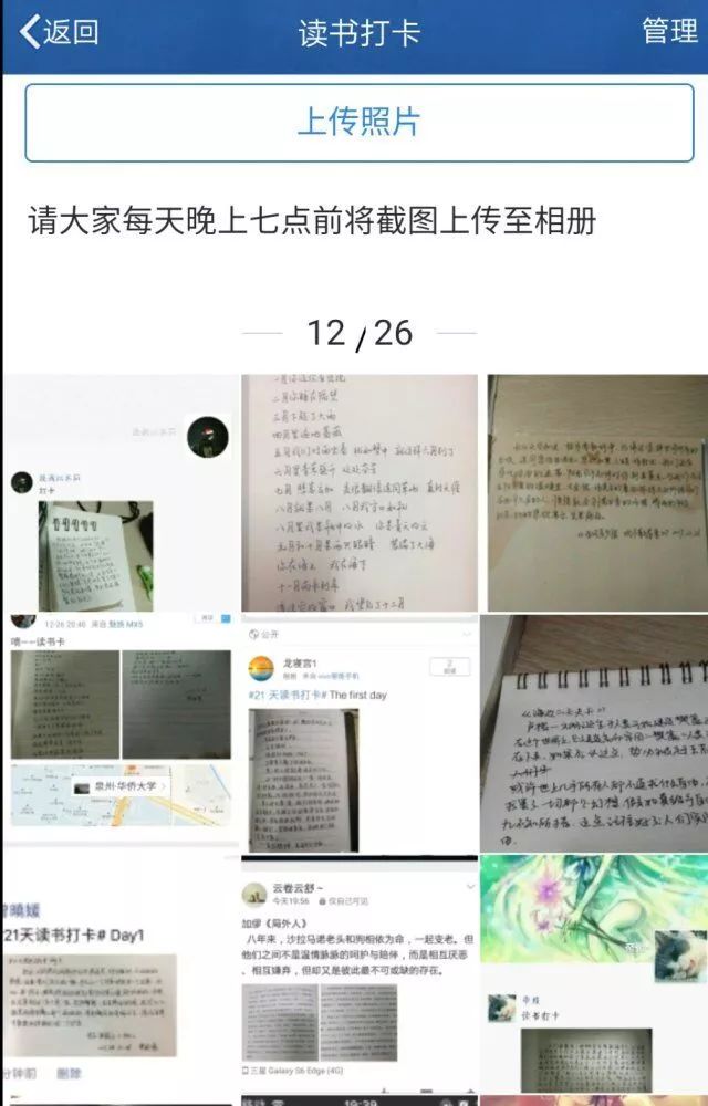 每天将自己所阅读的书籍(不限阅读书目数量,但提倡精读)抄写一段文字,包括书名、时间,以照片的形式记录,在个人社交平台上每天记录打卡(用手机微信或QQ发表朋友圈或说说。)并将照片上传至群相册。通过几天的打卡,可以看到大家平时的阅读范围非常广泛,在活动中我们也能更好地分享读书经验与心得。