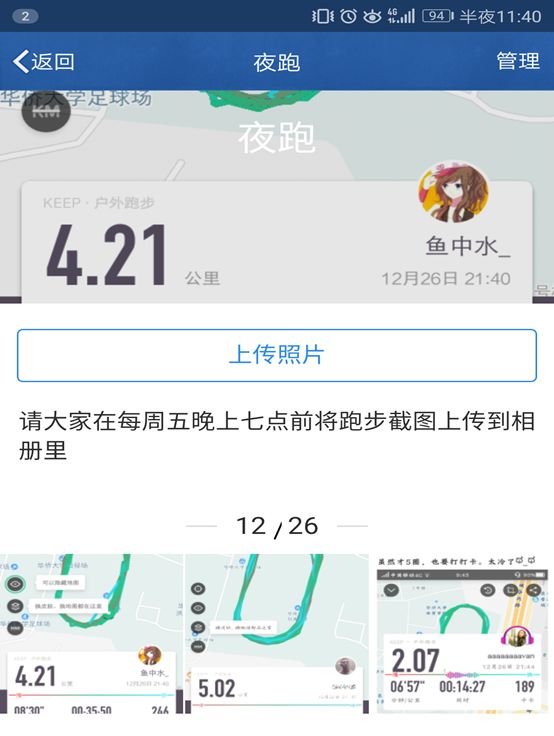 每周一次班级夜跑活动,旨在增强同学体质,学习之余锻炼身体。要求每人跑四圈,时间不限,自行选择,下载悦动圈等计步软件进行记录。期末月即将到来,紧张的复习中也不能缺少运动。没有暖气的冬天,与其缩在宿舍瑟瑟发抖,不如跑上几圈暖暖身体~