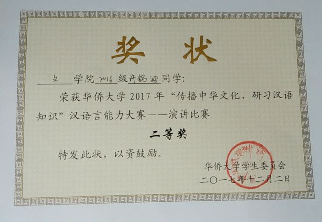 10.2017境外生汉语言能力大赛 演讲 二等奖