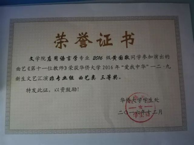 黄国敬,女,汉族,出生于1998年4月26日,华侨大学文学院应用语言学专业2016级学生,2016-2017学年获得国家励志奖学金。