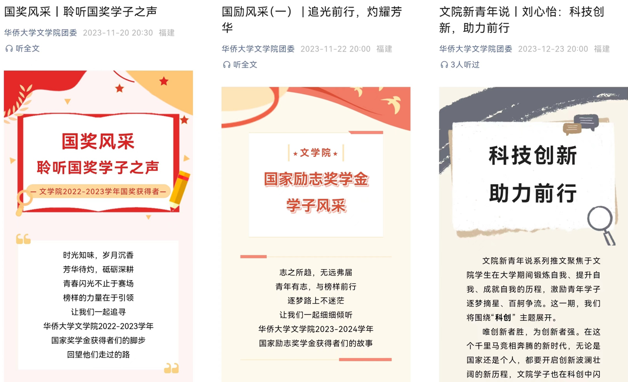 本学年,“文学院团委”公众号共计发布5篇“新青年说”,1篇国奖推送,3篇国励推送,共计涵盖34名优秀学生,其分享的内容涵盖科技创新、专业学习、志愿服务等多个层面,为学院学生尤其是低年级学生提供学习榜样。