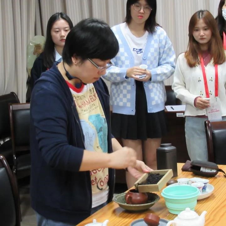 合影留念后举行校友品茗会,校友郑冰芳老师为我们讲解茶文化并进行茶艺展示。各位服务队成员积极参与品茶,学习茶文化,现场气氛欢快,老师同学们相互分享自己品茶后的感受,对郑老师的茶艺表示一致好评。